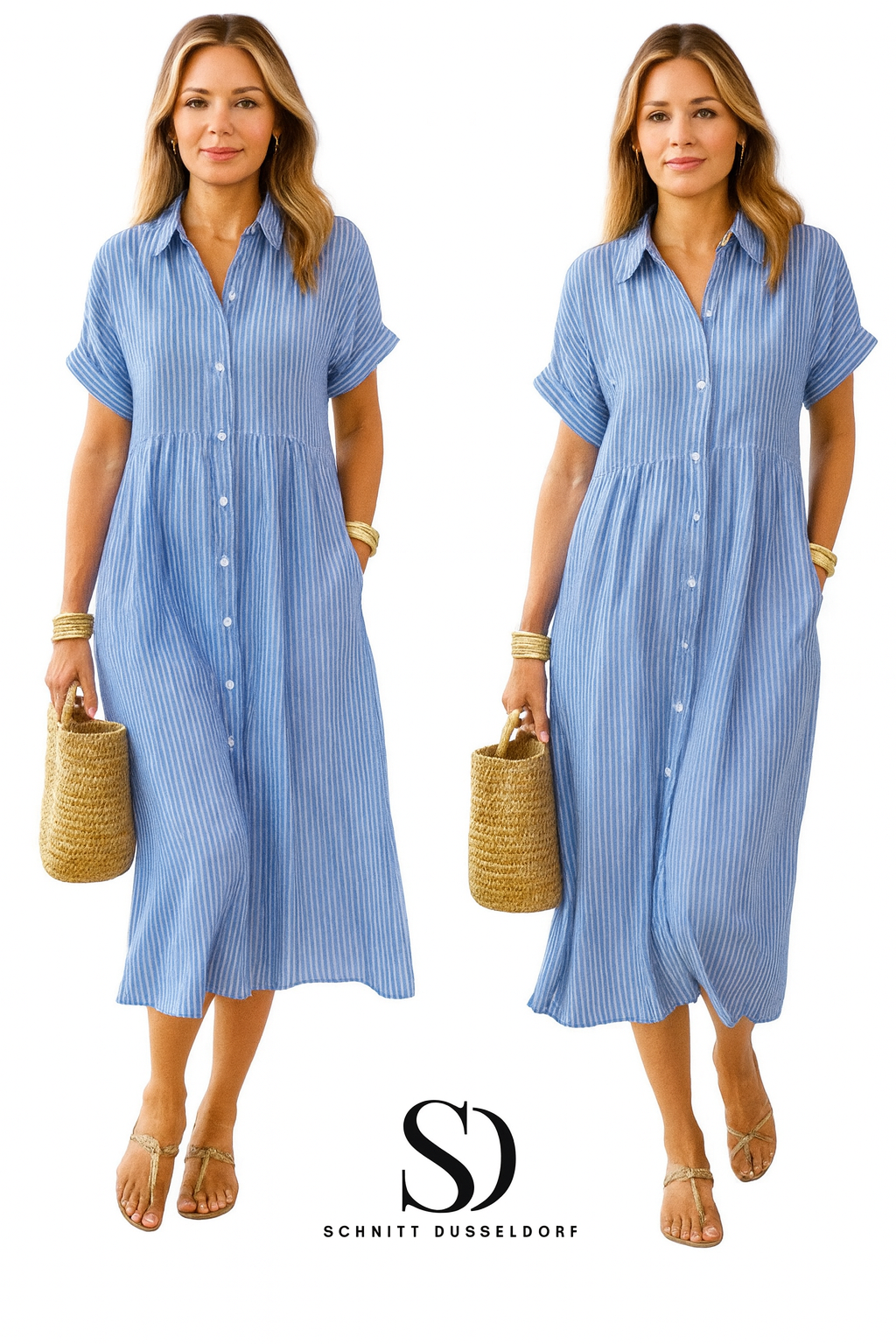 Gefertigt aus einem weichen, atmungsaktiven Baumwoll-Mix, schmiegt es sich sanft an den Körper, bewahrt den ganzen Tag über seine Form und sorgt für ein angenehm kühles Tragegefühl. Der klassische Kragen, die durchgehende Knopfleiste und die kurzen Ärmel verleihen dem Kleid eine gepflegte, zugleich mühelose Ausstrahlung.